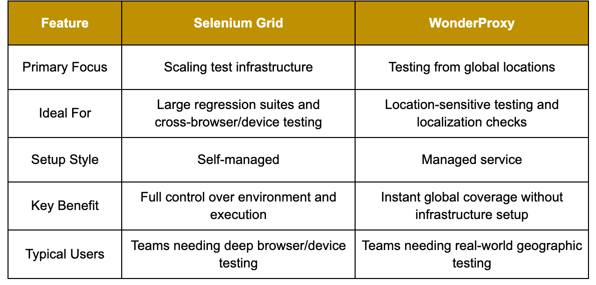 Neither tool is better, since each is built to solve different challenges. Selenium Grid is ideal for scaling test infrastructure and ensuring comprehensive coverage of browsers and devices. WonderProxy is the go-to when you want to see exactly how your app works from anywhere in the world. Used together, they give you the best of both worlds with broad coverage and real-world confidence